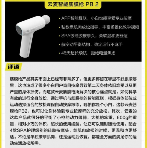 智能筋膜枪PB2是云麦科技的最新款筋膜枪单品,上市不久便与苹果等众多大牌单品一同入选36氪2022秋季焦点产品,被评价为“能全方面满足你的运动生活放松所需,哪怕你是小白,也可以让你体验到专业按摩师的充分放松”。