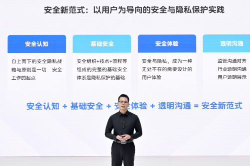 首先是,安全认知。自上而下的安全战略与原则,是一切安全工作的起点;第二,是基础安全体系。一个由安全组织+技术+流程+工具等等组成的完整的安全体系,是隐私保护的基础;第三,是安全体验。安全隐私,实际上已经成为一种无处不在的需要设计的用户体验;最后,是透明沟通。与监管、行业和用户的透明沟通,可以使企业的安全能力得到有效的检验,为安全能力的提升创造更好的条件。