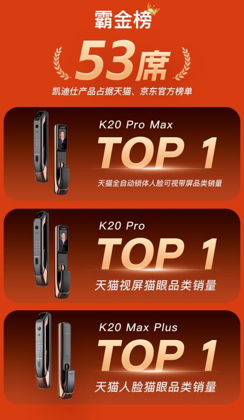 根据凯迪仕官方发布的战报,在本次双十一营销活动中,凯迪仕爆款K20系列可谓是大放异彩。其中,凯迪仕智能锁“千里眼“K20 Pro Max占据天猫全自动锁体人脸可视带屏品类销量Top1;K20 Pro占据天猫视屏猫眼品类销量Top1;K20 Max Plus占据天猫人脸猫眼品类销量Top1。