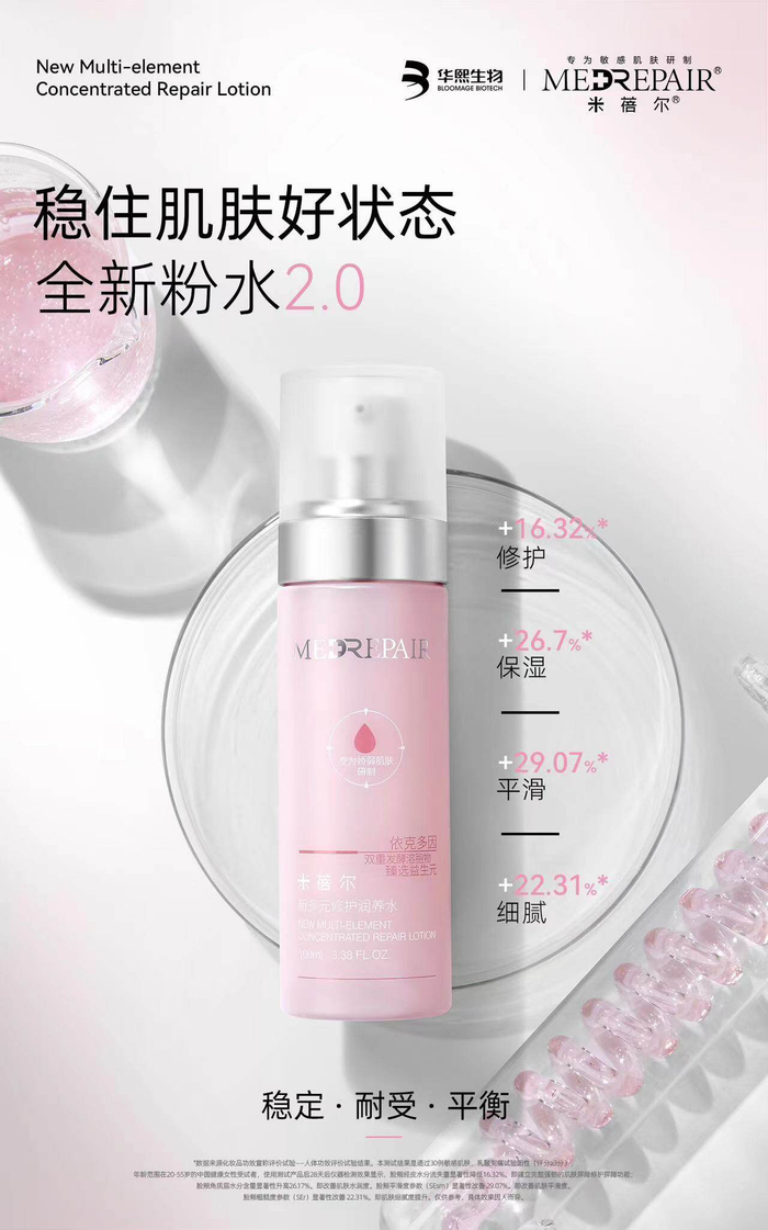全新升级的“粉水2.0”则是今年米蓓尔脱胎换骨的升级之作。米蓓尔方面表示,“粉水2.0”在成分、功效、肤感、包装上大刀阔斧,做出了突破性的调整。比如在成分上,其绝非只是单一成分增加,而是应用到了华熙生物合成生物技术,并添加米蓓尔专利技术”ECT-HA智配协同科技“,提升肌肤耐受力,更加适合敏感肌人群使用。