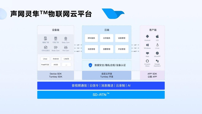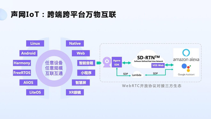 事实上,声网目前已经是一个在RTC领域覆盖终端和场景最全的行业玩家,在IoT赛道发展过程中,也在不断地打破平台的限制,做到真正跨终端、跨平台的全面互通和万物互联。从主流的Android系统到Linux系统,甚至像Harmony、FreeRTOS、AilOS等小平台都做了全面覆盖和深度适配。今年声网也丰富了设备以及不同媒体形式和Native、Web、小程序的互通。以海外智能音响为例,通过Web RTC开放协议支持,落地了amazon alexa和Google assistant的互通,帮助出海和海外用户能够在智能家居场景当中,轻松和声网设备互联,这个解决方案也适用于拓展任意标准Web RTC的开放平台。