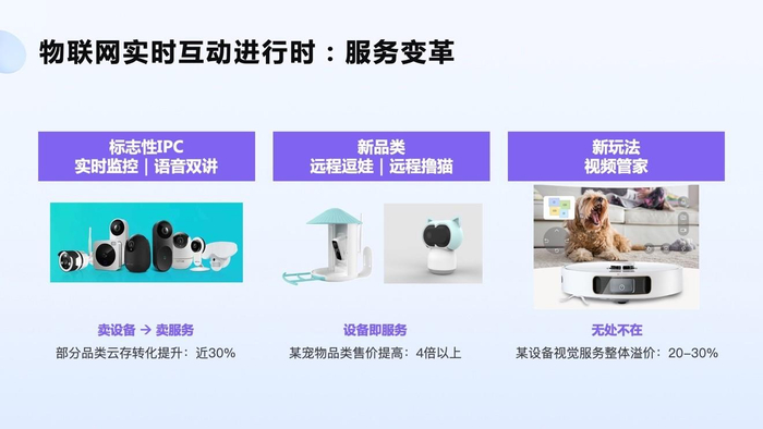 第二类是软件服务驱动用户黏性的细分场景 ,实时音视频服务帮助像婴儿、宠物、老人陪伴等产品实现了设备即服务的业务逻辑。