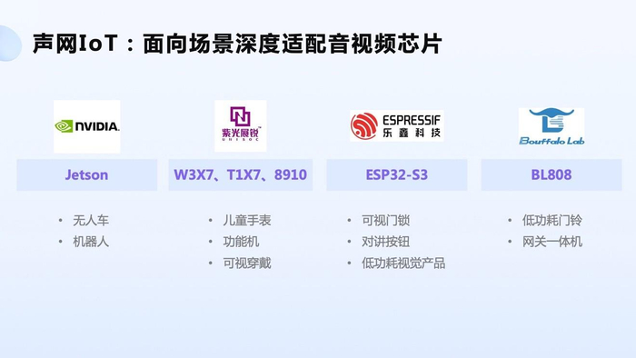 硬件上,面向不同硬件应用场景,声网的IoT解决方案深度适配了不同的音视频芯片,围绕产品和平台不断拓展一体化的方案,帮助开发者降低集成门槛。如面向无人车、机器人场景,适配英伟达Jetson系列;和紫光展锐平台进行合作,面向儿童手表、功能机和可视穿戴,提供小包体、低功耗的解决方案;基于乐鑫ESP32-S3的合作视觉品类方案,可用在门铃门锁和低功耗视觉产品当中。