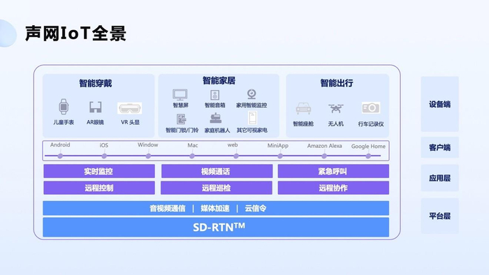 针对行业的趋势变化,声网也在不断地升级IoT全景解决方案。面向穿戴、家居和出行等多个音视频设备品类,依托声网的SD-RTN™大网,为智能硬件提供高可靠、低延时音视频流媒体和可靠信令消息能力,开发者可以使用声网SDK轻松实现视频通话、远程协作、远程控制、紧急呼叫等功能。