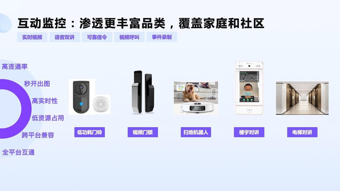 在面向消防安防和民用安防监控场景中,声网提供的实时互动能力,不仅可以满足监控类设备更快、更流畅地实现实时视频和语音双讲能力,还能为这类设备提供视频呼叫、告警消息和事件录制等能力。除了经典IPC之外,声网的IoT解决方案还覆盖了门铃、门锁、家庭服务机器人、扫地机器人等品类,也衍生到了社区楼宇对讲、电梯对讲等这类设备,能帮助这些场景的功能体验达到99.9%的高连通率,毫秒级的秒开出图,400ms端到端时延和极低资源占用,能让SDK在侵入式设备中保持高性价比的体验,同时覆盖包括WiFi和4G设备的跨平台兼容和互通性,低延时的远程控制通道能力,让设备真正做到不止于看,还能够及时地操控和反馈。