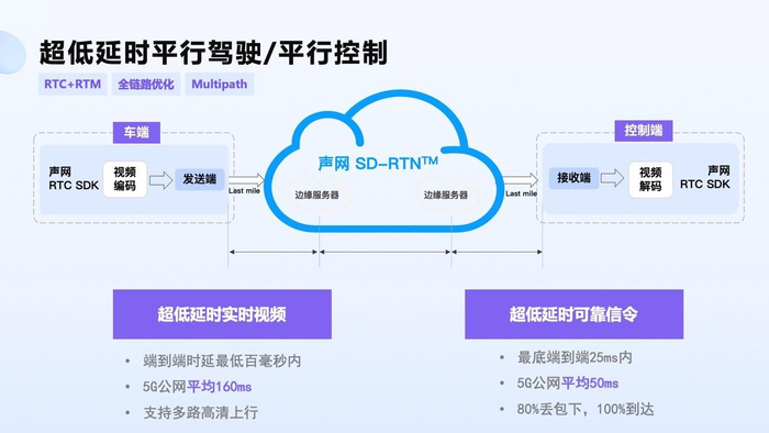 此外,在面向以无人车、机器人为代表一些智能设备远程运维、人工接管和远程控制场景,声网推出超低延时平行驾驶和平行控制方案。针对于同城远程控制,声网解决方案通过标记优先级优化路由调度策略和同节点转化方式,保障该场景下的延时传输质量。同时还结合了多运营商物联网卡场景下,通过Multipath多路径融合的技术,保证网络质量的可用性和弱网对抗能力。实测数据显示,从无人驾驶车辆摄像头画面采集,到远程控制台显示,声网能做实时音视频端到端时延最低百毫秒内,5G公网平均160ms;可靠信令可以做到端到端25ms之内,5G公网平均50ms,可以保障低速自动驾驶车辆在30公里时速下,拥有相对可靠、安全和高效沉浸式的体验,来完成所有的远程作业。