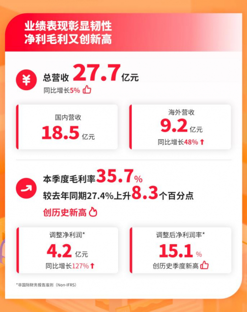 北京时间11月14日,名创优品集团(NYSE: MNSO;HKEX: 9896)公布了2023财年第一财季未经审计财务报告。该财季,名创优品第一财季总营收人民币27.7亿元,其中国内营收18.5亿元;海外收入9.2亿元,同比增长48%。值得一提的是,海外收入占比的稳步提升,展现了名创优品强韧的市场灵活性和抗风险能力。