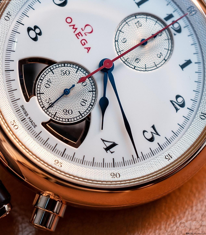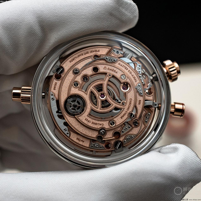 整个机芯的夹板、包括三问报时音簧,都是用欧米茄18K Sedna金制作(即欧米茄独家配比18K玫瑰金),机芯装饰配的上这枚大复杂表。并且在奥林匹克1932追针报时、超霸追针报时这两款上,都用了珐琅盘、玑镂雕刻,手表从内到外,细节到位。