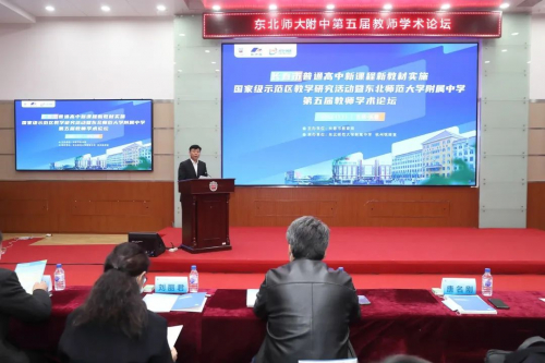 东北师大附中校长邵志豪致欢迎词。邵志豪校长首先对与会专家、校长、老师的到来表示了热烈的欢迎。邵校长指出教育科学研究工作对推动新课程新教材落地具有重大意义,长春市教育局积极开展了多次国家级示范区教学研究及成果展示活动,东北师大附中作为吉林省首批新课程新教材实施国家级示范校,在今后的工作中一定牢记使命、敢于担当,和其他示范校紧紧团结在一起,在长春市教育局的领导下积极开展区域协作,办好“教师学术论坛”这一提升教师学术能力和学术视野的教研平台,勇于探索并解决好“双新”改革中的重点难点问题,为办好春城人民满意的教育尽应有之力。