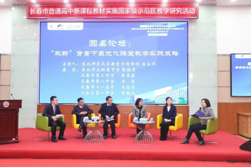 接下来,东北师大教育学部部长吕立杰教授主持了以“‘双新’背景下最优化课堂教学实践策略”为主题的圆桌论坛。东北师大附中高中部副校长张福彦、长春市第二中学副校长彭景茹、长春市第八中学副校长王晶、长春市十一高中副校长王忠学、九台区第一中学副校长李殿成参加了论坛。圆桌论坛中,五所学校以“双新”背景下最优化课堂教学改革经验介绍为切入点,紧紧围绕“‘双新’背景下课堂教学改革的基本逻辑、基本过程,如何让学习真正发生?”等问题进行了深入的思考和讨论。