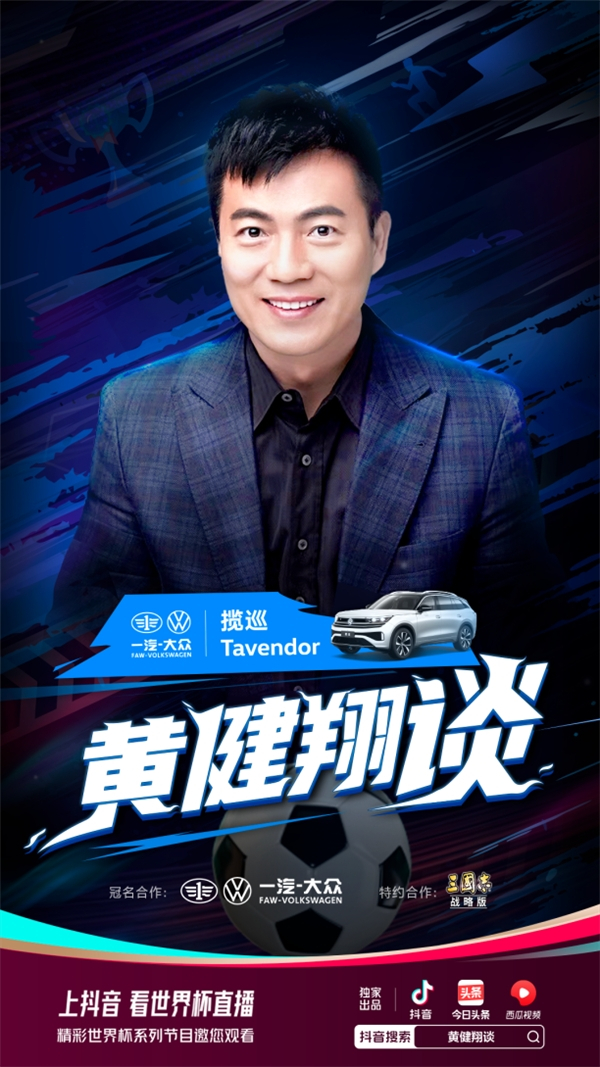 此外,抖音还将推出《黄健翔谈》《白说世界杯》等节目。在抖音搜索【世界杯】进入专题页,大咖评球,免费超高清直播,边看边聊等你来。