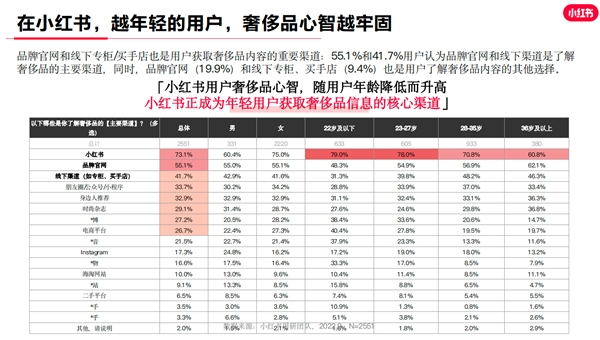 此外,我们观察到的另一个趋势是:越年轻的受访用户群体(27岁以下),越依赖新兴社交&内容平台来获取奢侈品相关信息(如小红书、微信、微博、抖音、B站等 )。 这个趋势在小红书平台尤为明显。