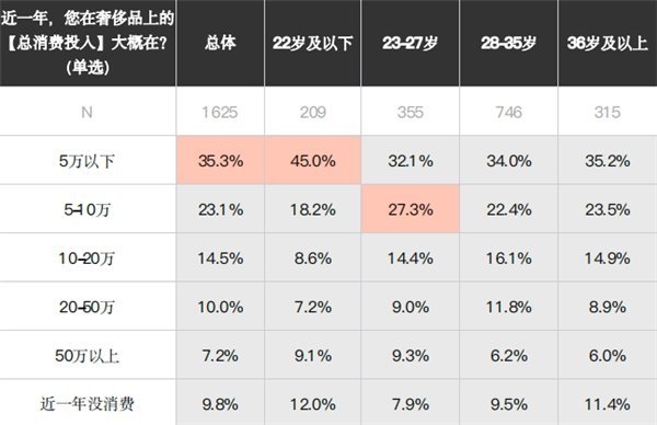 值得注意的是,年轻用户群体也具有高消费力,潜力极大。报告数据显示,四成00后用户和六成95后用户的奢侈品年消费在5万元以上。