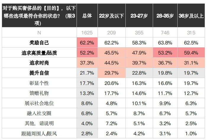 总体来讲: 悦己、追求品质生活和追逐时尚,是用户购买奢侈品的三大原因。受访用户所处年龄段不同,消费核心驱动力略有偏差: 22岁及以下用户购买奢侈品时更注重追求时尚、提升自信,而36岁及以上用户则更注重追求品质。