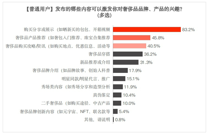 报告数据显示,排名前三的内容类型分别为: 奢侈品的购买晒单或开箱(78.6%)、产品推荐(51.2%)以及奢侈品穿搭(41.7%)。可以看出,受欢迎的内容多为第三方(非品牌方)的用户真实体验,如晒单开箱和穿搭,这与小红书“标记我的生活”的定位不谋而合。而且由于奢侈品天然的高门槛,小红书用户对于指南、科普类的信息也较感兴趣,如产品推荐和品牌介绍。