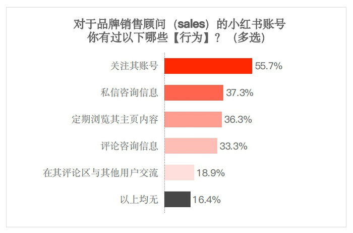 -品牌销售顾问: 与其他作者内容输出为主不同,这类作者呈现出粘性强(高关注率)、互动性高(私信、评论频繁)的特点。 小红书用户通过与品牌销售的互动,实现 “了解并产生好感—种草—拔草”的一条龙高效闭环转化。