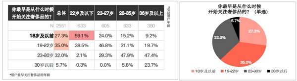 除此之外,报告数据分析发现,受益于信息传播媒介和奢侈品宣传渠道的爆发,用户首次关注奢侈品的年龄段呈年轻化趋势,为潜在奢侈品消费的用户画像带来了更多可能性。受访用户中,总计有六成以上用户在23岁前开始关注奢侈品,其中24%的95后和59.1%的00后用户在18岁前就开始关注奢侈品。