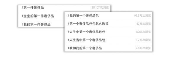 首先,消费人群的身份属性多样化属于奢侈品行业的一大特征。奢侈品不再是职场人专属,普通职员、管理者、学生、自由职业者、家庭主妇等不同消费群体涌现在这一赛道。在小红书平台UGC内容中,个人首次消费奢侈品单个话题最高浏览量达176.1万次,各类用户对奢侈品购买均具有分享欲及阅读偏好。