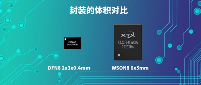 目前更多应用领域对小型化和集成度有更高的要求,芯天下在业内率先将64Mbit的芯片做进DFN8 2x3x0.4mm的标准封装里,与传统的WSON8 6x5mm封装相比面积减小了80%,厚度也由0.8mm降到0.4mm。传统的64Mbit小型化封装通常是非标准化的WLCSP封装,需要客户端PCB板定制,芯天下通过先进封装工艺做成DFN8 2x3x0.4mm的标准封装的64Mbit芯片可以直接兼容替换同类型封装产品。另外该封装在信号完整性和散热上亦有优势。