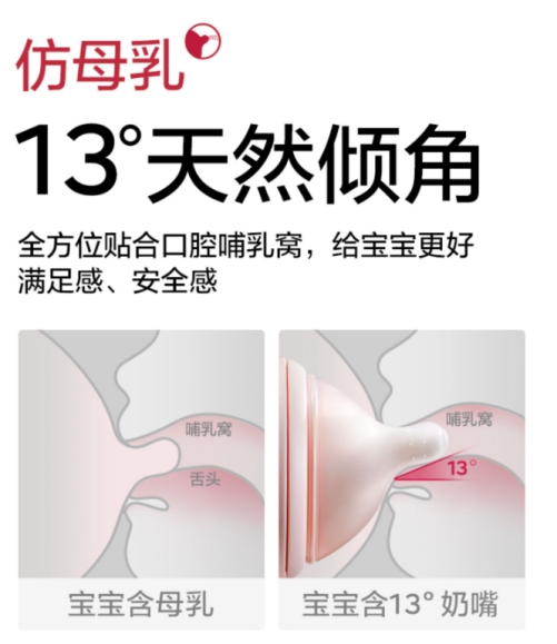 01)宝宝喝奶时需要把RT含至哺乳窝,13°歪头倾角的设计能够更好贴合宝宝口腔中的哺乳窝,既能给宝宝母乳喂养般的满足感和安全感,又能有效减少胀气风险。
