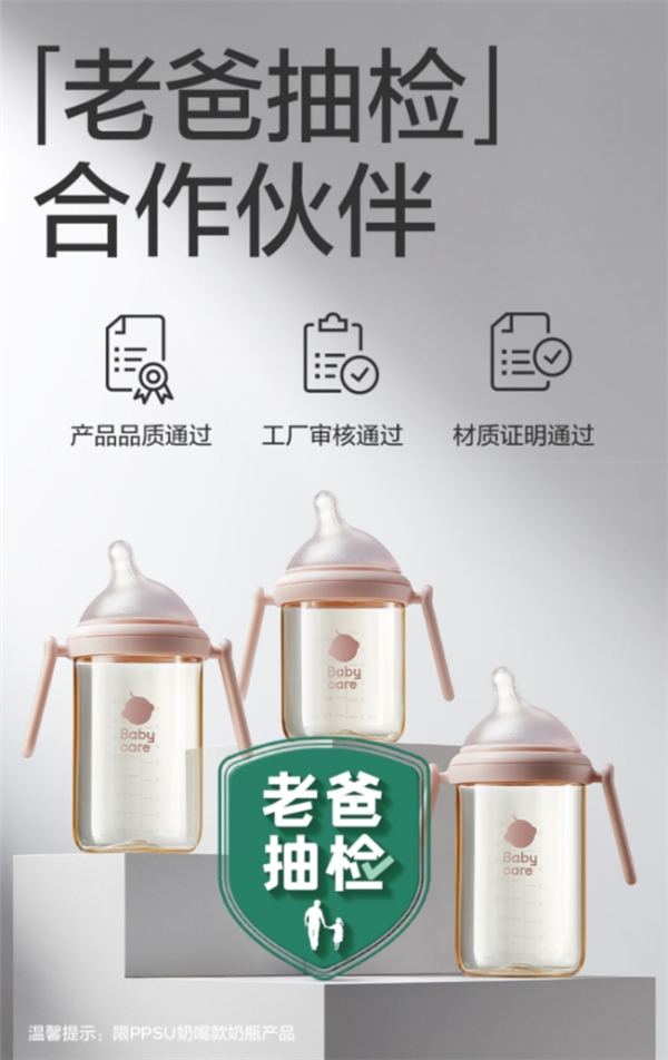 在洞察宝宝真正需求,反复自问下,今年8月,头部母婴品牌Babycare深研宝宝在母乳亲喂时的吮吸轨迹,匠心打造了一款更接近母乳亲喂的“歪头仿母乳PPSU奶瓶”。为进一步审视产品使用的安全性,打造经得起考验的品质好物,老爸抽检”来“挑刺”,从原料、生产过程、产品品质全方位进行评价。最终该产品通过层层考验,获得【老爸抽检】品牌标志授权,正式成为老爸抽检的合作伙伴。