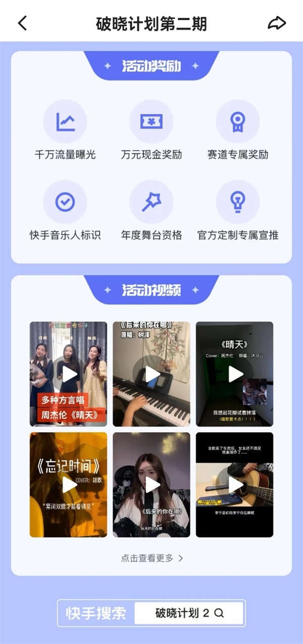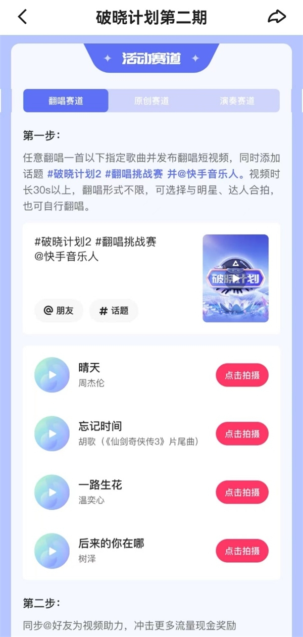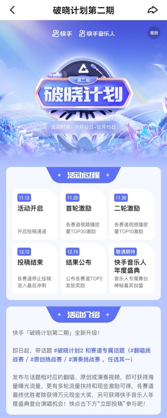 活动期间,用户发布视频,同时添加#破晓计划2 和赛道专属话题(#翻唱赛道/#原创赛道/#演奏赛道)并@快手音乐人,即可参赛。此外,在视频中同步@好友,为参赛视频助力,还可获得流量现金奖励。