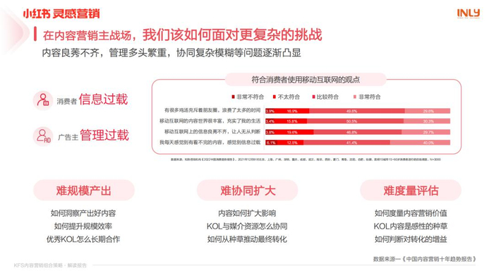 内容种草虽是营销利器,但只是堆达人、铺笔记并不总是行之有效。*超过80%的消费者会感到「信息过载」,品牌方也会遭遇管理难题:规模产出难、协同扩大难、度量评估难。所以,现在除了优质内容外,更需要精准地触达、科学地评估,以深度有效地介入消费者决策。