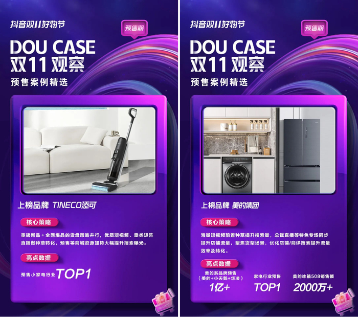 例如,新锐家电黑马TINECO添可就以本次活动为原点,诠释当代年轻用户对高端智能生活方式的想象,实现预售爆发。品牌依托抖音电商内容场景资源优势,通过官方矩阵账号以及垂类达人持续以优质短视频做种草、联合长期合作的垂类达人做日播和专场,同时撬动站内头部达人合作快速引爆品宣和销量。通过“抖音双11好物节”,TINECO添可智能洗地机芙万2.0位列本次双十一预售小家电行业TOP1。