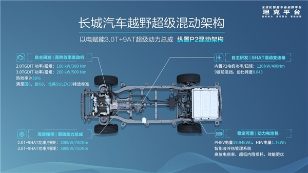 长城汽车3.0T V6发动机顺应时代新能源化发展趋势,加速推动长城汽车新能源战略落地。该机型全部搭载了48V轻混技术,进一步降低了油耗,并在提升平顺性方面取得良好效果。此外,今年成都车展上,长城汽车发布的坦克平台越野超级混动架构,就包含了由3.0T V6发动机与长城汽车自主研发的9速纵置混动自动变速器——9HAT组合而成的高阶混合动力总成,该动力总成峰值功率可达380kW、最大扭矩750Nm,满足用户对越野电动化的双向体验需求,加速长城汽车新能源战略落地。