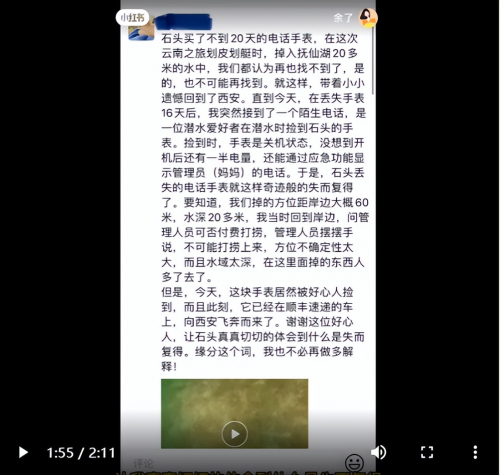 当大家都以为事情到这里就结束时,在16天后,事情竟然发生了转折。一位潜水人员在水中捡到这块手表,一开始他还以为手表已经没电了,然后被身旁一位小朋友按开了,而且还有50%的电量。后来他通过手表里面紧急管理员的电话,成功找到了小朋友的妈妈(博主自己),也让这块电话手表“失而复得”。