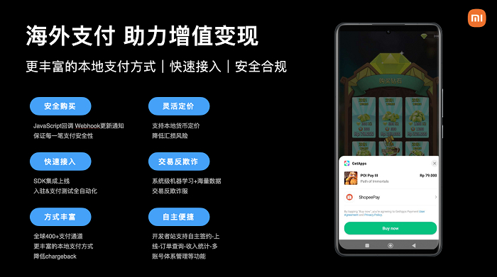 此外,小米海外业务也在持续发力。2022年第二季度,小米境外互联网服务收入人民币17亿元,同比增长52.1%。支付方面,小米开发了相应的技术能力,海外的IAP SDK与小米国际应用商店GetApps无缝集成,一站式支持游戏开发者上架商店变现。该功能可快速完成集成上线,支持自动化入驻和测试,每一笔交易都安全可查,丰富的本地支付方式和交易反欺诈能力可大幅减少退款。