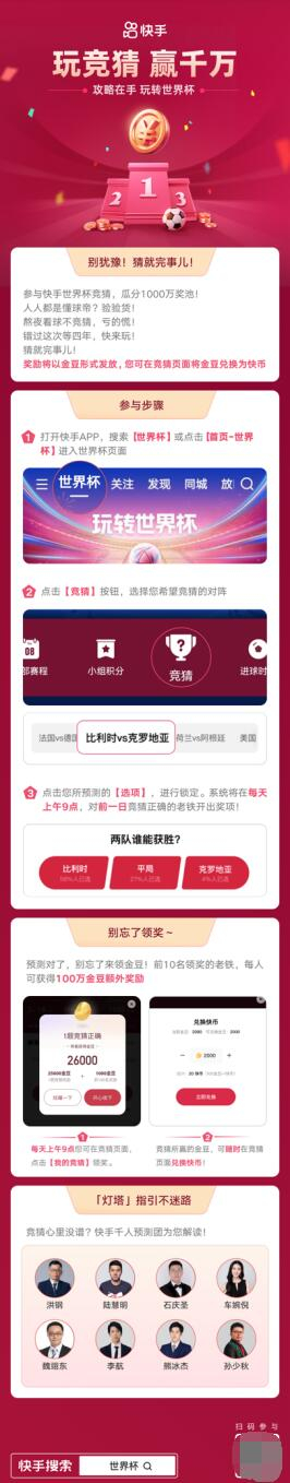 在这四年一度的足球盛宴,快手推出世界杯竞猜互动玩法和内容,设置了价值千万人民币的奖池,拉满观赛竞猜氛围,还有“世界杯千人预测团”加入,由足球解说评论员、足彩专家、足球运动员等专家提供更专业的赛事分析,帮助老铁猜冠军更有门道。