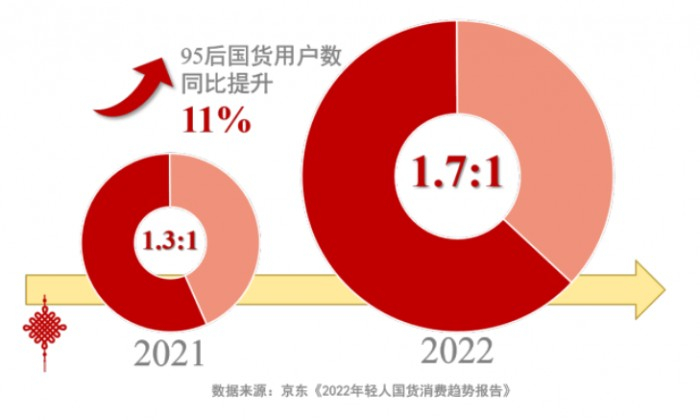 近年来,双11已成为国货集中展示的重要舞台,国货消费占比明显提升。根据天猫数据显示,10月31日晚8时活动启动后第一个小时内,天猫102个品牌实现破亿,其中有超一半是国货品牌。据《2022年轻人国货消费趋势报告》显示,今年以来,年轻消费者较以往购买了更多的国产商品,其中95后用户占比同比提升11%,购买国产商品与进口商品的用户数总体比值为1:7。