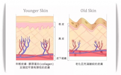 随着年龄的增长,成纤维细胞的合成能力下降,体内胶原蛋白流失的速度加快,随着皮肤代谢周期延长,从而导致肌肤失去光泽、弹性,皱纹越来越明显。同时真皮的纤维断裂、脂肪萎缩、汗腺及皮脂腺分泌减少,使皮肤出现色斑、皱纹等一系列老化现象。