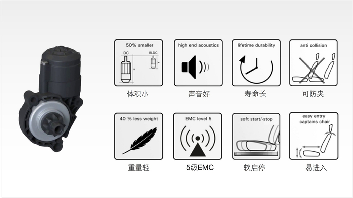 值得一提的是,这款电动长滑轨运用了博泽自研的无刷电机。相比起普通的控制电机,无刷电机更灵活,通过调整程序,可以改变座椅滑动的速度。在无刷电机的支持下,座椅调节还可以实现软启停、防夹、易进入等应用功能。
