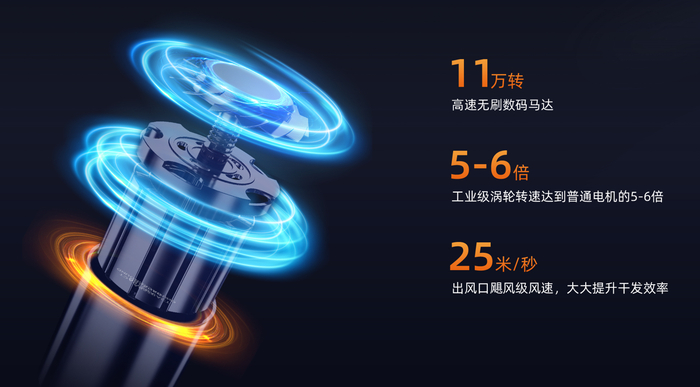 与传统电吹风通过高温烘干头发的原理相比,这款osak橙飒卡超静音高速吹风机内部采用11万转高速无刷数码马达,转速是传统吹风机的5-6倍,气流更强劲,风口吹出的超高风速高达25米/秒,风速聚焦可快速吹散头发上的水分,实现五分钟低温速干秀发。如果传统吹风机需要十分钟吹干头发,那么osak橙飒卡超静音高速吹风机只需要两三分钟就可以达到干发效果。
