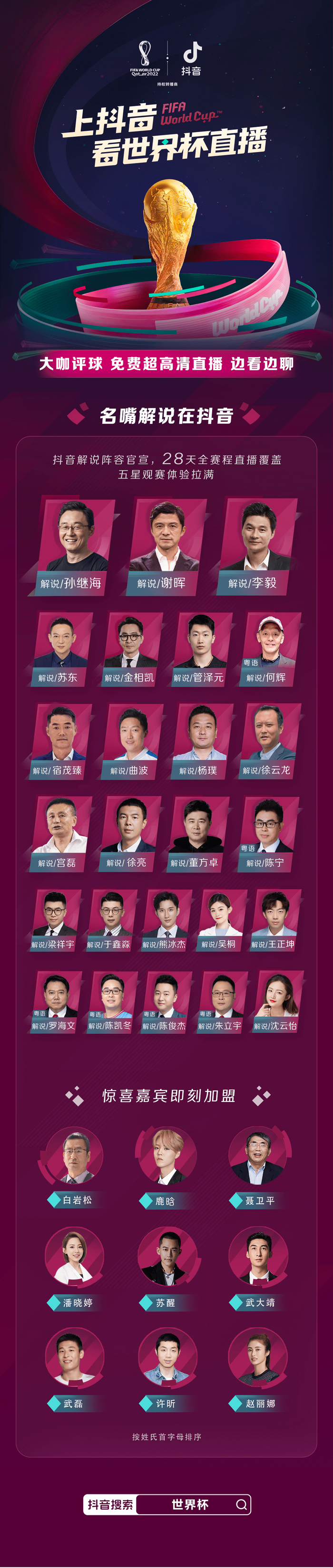 2022FIFA世界杯临近开赛,孙继海、谢晖、苏东、金相凯、李毅、武磊、管泽元等将在抖音赛事直播间,为大家带来世界杯精彩解说。未来28天赛程中,白岩松、鹿晗、聂卫平、潘晓婷、苏醒、武大靖、许昕、赵丽娜等嘉宾,也将在抖音赛事直播间惊喜亮相。