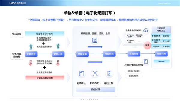 单轨制+单套制解决方案,则彻底打破了“双轨制+双套制”的弊端。作为电子会计档案全生命周期的专属管家,合思·易会档推行电子文件“单轨制+单套制”,并通过这一路径实现电子会计档案的核心应用价值——会计档案不打印。在合思·易会档在企业内部全面落地后,电子文件、纸质文件将全部实行电子归档,仅保留纸质原文件及少量的具有永久保存价值的电子会计档案纸质打印件,作为备查。