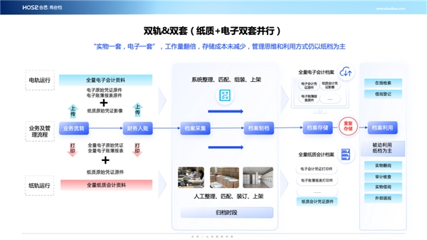 “现阶段,很多企业会采用‘双轨制+双套制’方式,这是最常见的,也最暗藏风险。双轨制之下,文件运行状态是线上线下流程并存的,在线上走完信息化流程之后,线下又打印出一套,降本增效无从谈起。会计档案存储和调阅也面临着巨大的问题,纸电混合的状态下,调取和借阅都会更费时费力。同时,也有一些企业只留存纸质的一套存档,而电子的没有做留存,这显然是不合规的。”柴晓男坦言,即便纸质档案和电子档案同时留存满足了合规性管理,但也无法避免地导致企业财务档案管理成本增加、企业财务档案的效率降低、员工使用意愿降低。
