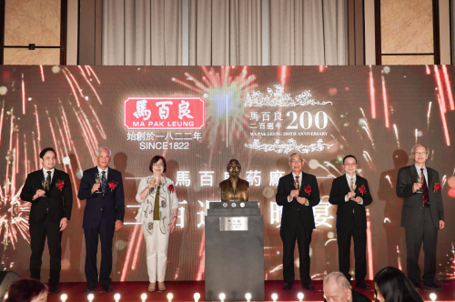 晚宴开始,全场嘉宾透过短片一起回顾了马百良药厂过去200年的各种经典时刻,接着由马百良药厂董事马泰炎先生上台致辞,亲自感谢这么多年默默耕耘和付出的马百良人,他期望马百良后人能延续药厂的传统,在未来继续守护市民的健康:「幼承庭训,药厂制药要帮助到市民,人人负担得起,令每个人都可以用到我们的产品,这个祖训和思想,历经几代,亦希望未来100年,以后每一代都能够传承这个传统。」 紧接着马百良药厂马泰炎先生连同两位董事马丽珠小姐、马浩桦先生、以及三位马百良药厂股东马邦荣先生、马邦洪先生及马民志先生一同上台主持百良公铜像揭幕仪式,正式为晚宴揭开序幕!