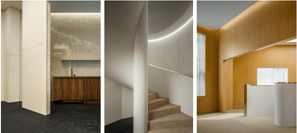 当你踏进USM旗舰店,首先映入眼帘的是覆盖有明亮哑光砂岩的一层空间,在步入一个较为正式与极具代表性的入口大厅后,便会经过铺着浅粉色琉璃瓦的厨房和餐厅区域,接下来沿着楼梯向上进入二楼,一个被设计为家庭办公空间的读书角和品牌图书馆组成的带天窗的客厅出现在眼前,这一区域被高挑层的空间所带来的自然光线全面覆盖,以木质建材与剑麻地毯共同组成休闲舒适的空间氛围,而地毯上的手工毛毯则为这一空间更添一份家的惬意;充满工业感的USM与温暖柔软的家居材质间的冲突,在这一空间中实现完美的平衡;经由走廊,客厅与入口大厅得以连接,走廊中一间USM专属定制空间的咨询室巧妙地框住日光,身处其中,来访者可以真正领略USM的独特魅力并开启专属产品的定制之旅。