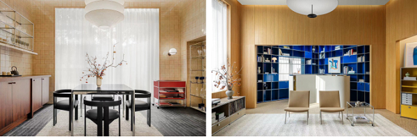 对于USM旗舰店整体空间的搭建,Halleroed Studio认为,“我们对USM旗舰店的设计理念,是希望能够在一个非常放松且与舒适的,让来访者在身临其境的家庭环境中去体验USM的独特魅力。”这对于制作精巧且金属质感较强的USM来说绝非易事。为了创造一个安逸的家居氛围,Halleroed Studio在设计初始便想为USM的产品与空间内的建筑材料之间制造一个反差,为此他们将多种以纯手工打造的建筑材料贯穿在整个设计之中:天然纹理的木板,粗糙的赤陶土地板,瓷砖,砂岩,纺织墙纸和剑麻地毯等来中和家具本身的工业金属感,期待借由这些柔软温暖的自然材料赋予空间更多感性的遐想。相比办公室或常规零售空间的单调,在USM旗舰店内,人们会发现更多家居空间中灵活有趣、多元共生的可能性,热情舒适的氛围使人们更容易联想到USM在自己家中的样子,这也恰恰与USM产品强大的场景适配性特点不谋而合。