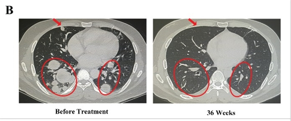 在HCC(肝癌)患者中,1人达到CR,2人达到PR,4人病情稳定。目标RR和DCR分别为33.3%和77.8%。经历CR的患者是一名61 岁的男性(图A),在经动脉化疗栓塞(TACE)和射频消融(RFA)治疗后复发性多发肝内转移。帕博利珠单抗(PD1抑制剂)激活的自体DC-CIK细胞输注14个周期后,肝内多处病灶消失,肿瘤标志物甲胎蛋白(AFP)水平降至正常范围。该患者通过进一步的维持治疗经历了310多天的PFS(无进展生存期)。另外两名部分反应者在接受8多个周期的活化自体DC-CIK细胞输注后也获得了超过150天的抗肿瘤反应。