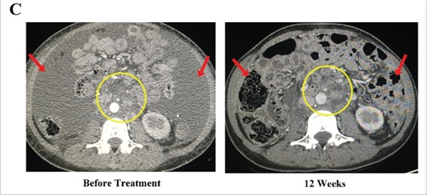 在RCC(肾细胞癌)患者中,客观RR和DCR分别为25%和75%,包括1个CR、1个PR和4个稳定疾病。达到CR的患者是一名34岁的男性(图B),在手术和阿昔替尼治疗后出现广泛的双侧肺转移和持续进展的疾病。在开始治疗后36周,他的转移性疾病完全消退。该患者继续接受维持治疗并经历CR。另一名部分反应者是一名 31 岁女性(图C),她在姑息性手术后出现大量腹水和多处腹膜后淋巴结转移。在派姆单抗(PD1抑制剂)激活的自体DC-CIK细胞输注开始后的12周内,这些腹水几乎消失,淋巴结转移灶减少。然而,由于贫血、血清AST和ALT水平升高以及甲状腺功能减退,她要求在16个周期后停止治疗。有趣的是,该患者在最近的一次随访中继续经历PR(超过240天)。