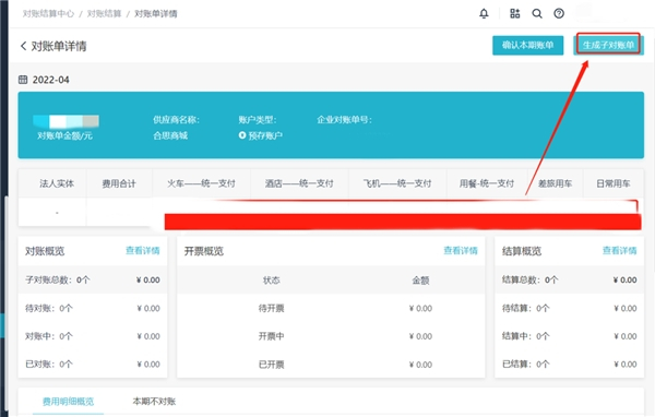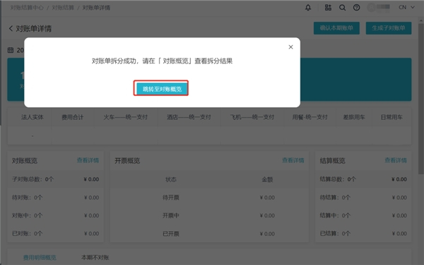 Step 2: 点击“生成子对账单”,系统会按照拆分规则进行创建子对账单。