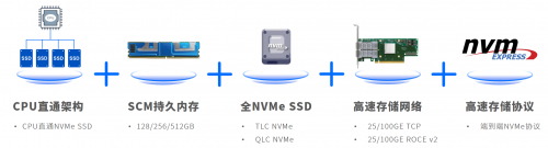 全栈全闪化设计 :采用“CPU直通架构 + SCM持久内存 + NVMe SSD +低时延RDMA网络 +端到端NVMe协议”五位硬核技术于一体,构建全栈全闪化分布式存储硬件架构。