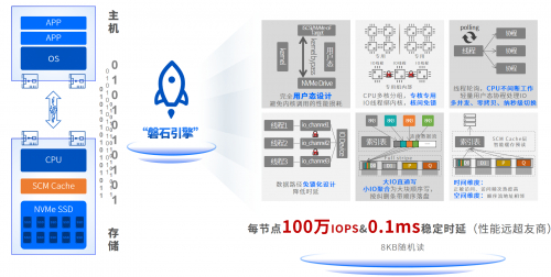 “磐石引擎” :在存储软件栈层面,通过自研“磐石引擎”:全用户态设计、CPU资源无锁化、独立线程模型、介质资源无锁化、大IO直通小IO聚合、智能缓存预读,驱动基础硬件永续加速,实现“性能爆炸,火力全开”。