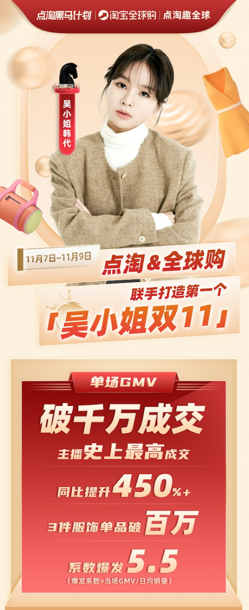 她不仅多次实现单品成交破百万,还在今年双11创造了个人史上最高成交记录——直播间“吴小姐韩代”单场GMV超过千万元,同比提升了450%。