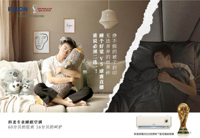 11月,科龙空调围绕“hi冠军16分贝轻音好眠”全面开启世界杯营销活动,立足球迷在世界杯期间熬夜观赛导致睡眠不足的痛点,结合16分贝轻音运行的睡眠功能优势进行营销场景搭建。创意海报、魔性短片、互动话题纷纷上线,走进南宁打造16分贝观察室,线上线下联动,趣味十足的营销方式与年轻消费者建立了更紧密的沟通与联系。
