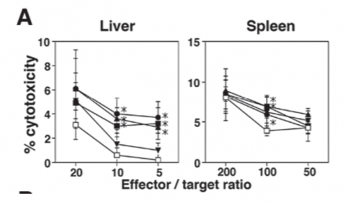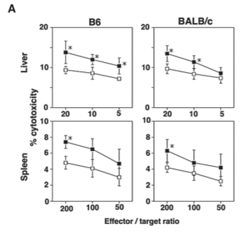 (Takeda & Okumura, 2021 | Biomedical Research ) 以 625 mg/kg/天的剂量口服 NMN 补充剂可增强脾脏和肝脏的细胞毒性。最佳效应/目标比率——NK细胞与癌细胞的比例——肝脏为5、10和20,脾脏为200。在这些比率下,被破坏的癌细胞百分比,即细胞毒性百分比,在 625 mg/kg/天的剂量下显着增加(图表上的实心方块)。这些发现表明,口服和注射 NMN 可以改善两种不同小鼠品系的 NK 细胞细胞毒性。